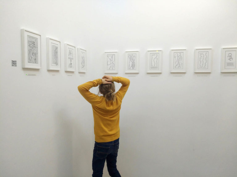 14th to 22th of September 2018 // Just in time! The new series with 72 drawings and one acrylic painting was complete and also my book with poetry and illustration was on the way. So we grabbed the friendly invitation from Rudolf Maximilian Becker to throw an exhibition at the marvellous gallery Weltraum again. Anna von Bergmann showed her wonderful jewelry (with a special fluctibus edition) and her daughter had an extra exhibition with her talented photos. Apart from that on the opening and on the finissage we had the opportunity to experience two extraordinary performances by two inimitable personalities. Andreas Ohrenschall delighted us with „Ohrenschalls Mythophagen – Peformance Nr 5“ and Nikolai Vogel exhilarated us with „Die Abhängung der Kunst / Taking down the art“. Thanks so much to all involved parties, everyone who helped and everyone who came along and especially to Daniel Schvarcz for the photos and Rudolf Maximilian Becker for having us!