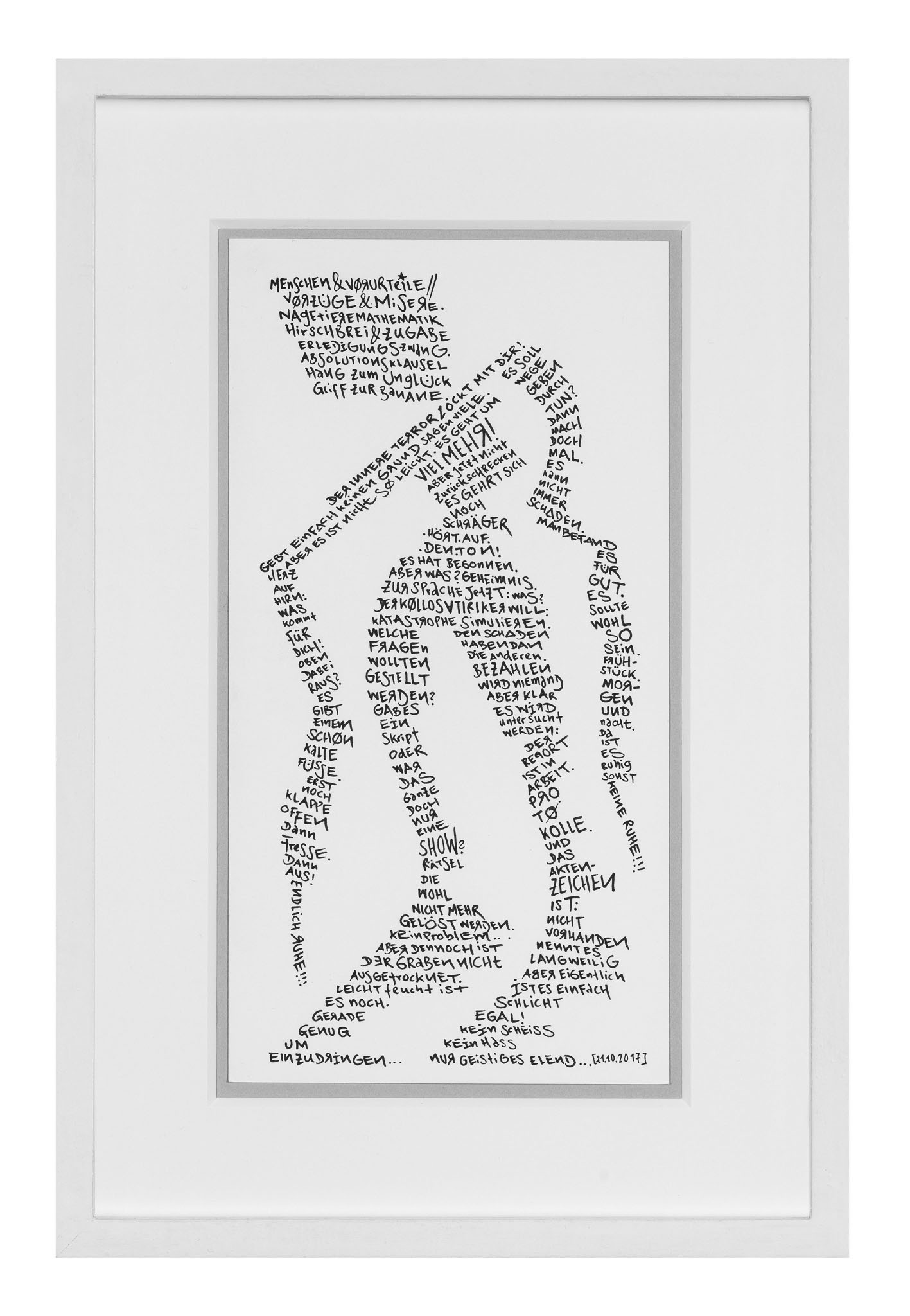 [Original drawing, pigmentmarker on invitationcard, 11 x 21 cm, passepartout, handmade frame, 20 x 30 cm, museum glass, 21.10.2017] Photo: Daniel Schvarcz // www.d-s-photo.com